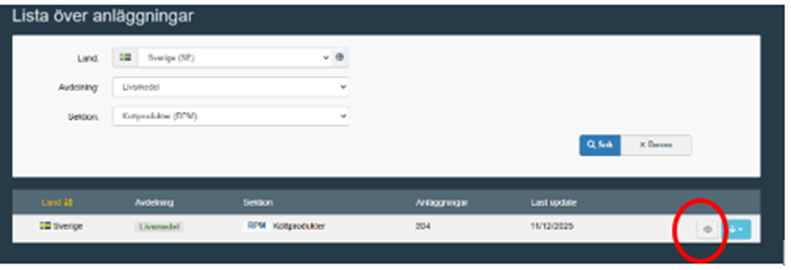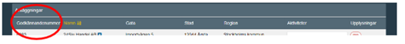 För att lättare hitta ett specifikt anläggningsnummer kan du klicka på ”godkännandenummer” så sorteras anläggningarna i nummerordning och du kan skrolla i listan efter det anläggningsnummer du letar efter.